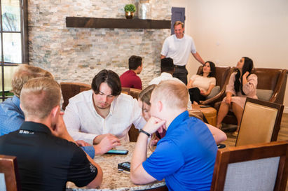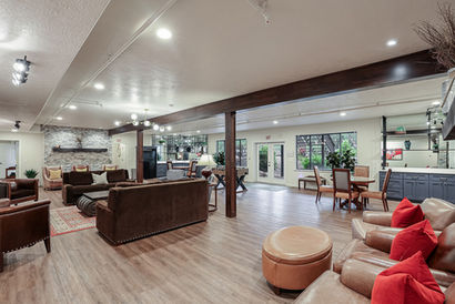 Our club style 1,500 sq ft lounge area offers comfortable cool relaxing seating flanked with two courts countertop bar areas and custom fitted pipe shelving & an area for a game of foosball table and shuffle board. The room has mood setting lighting and can be opened up depending on what type of special event you are having. It offers different conversation areas within the room as well as a large 85 inch flat screen TV that can be used for entertaining or group presentations.
